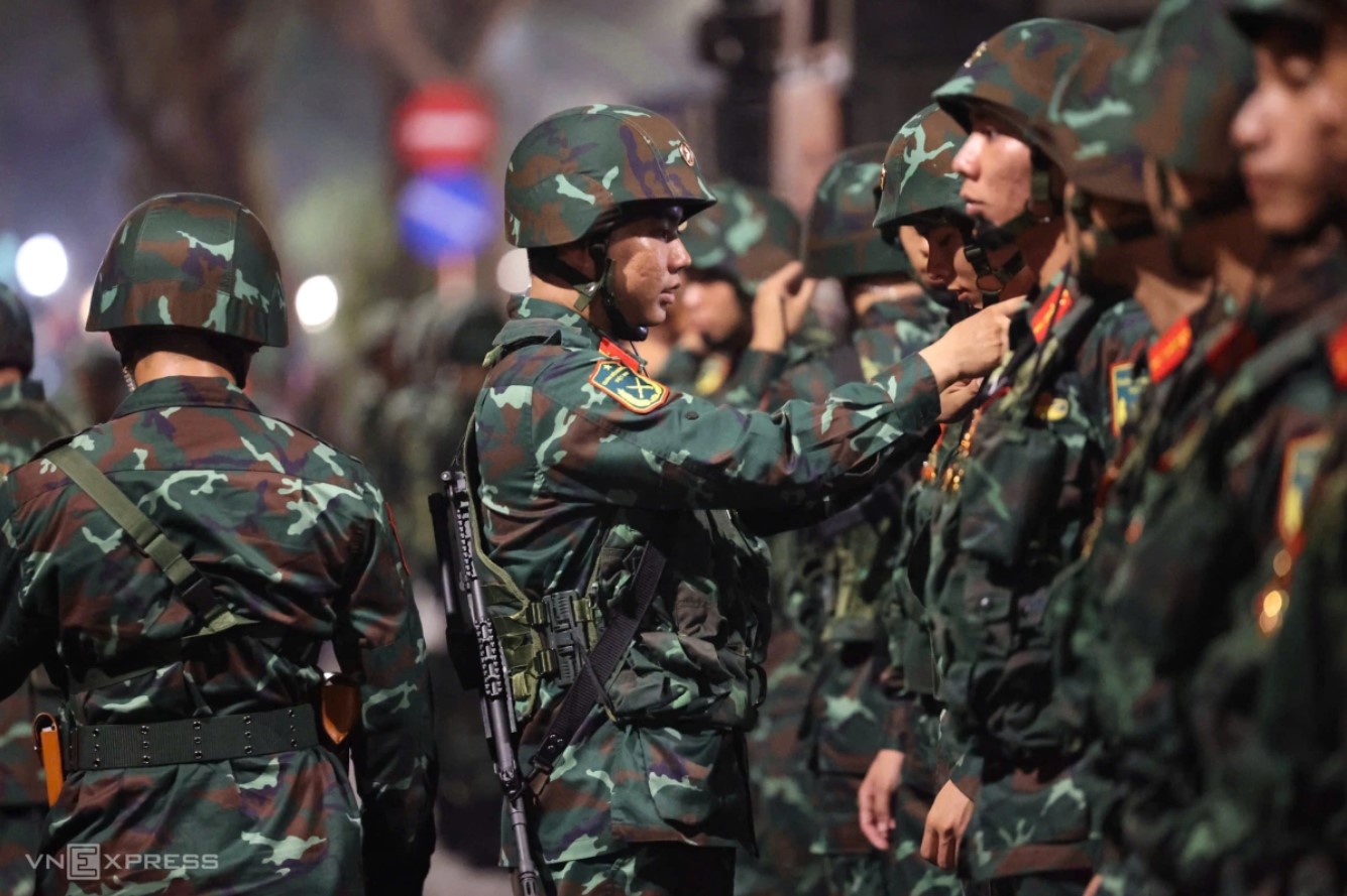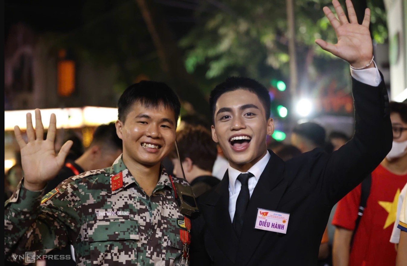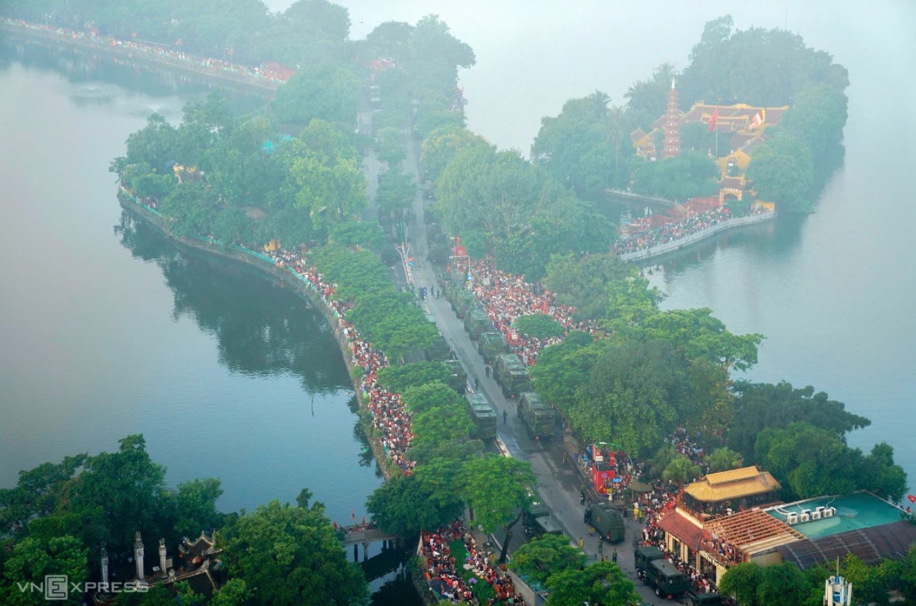 Trên các tuyến Trần Phú, Điện Biên Phủ, Kim Mã, Nguyễn Thái Học, từng hàng dài người đứng sát barie, nhiều gia đình cho trẻ nhỏ ngồi trên vai để nhìn rõ hơn. Hàng nghìn cựu binh được xếp chỗ ngồi ưu tiên, háo hức chờ đoàn quân tiến qua. Trong khán đài, các đoàn đại biểu trong và ngoài nước ngồi kín hơn 30.000 ghế.