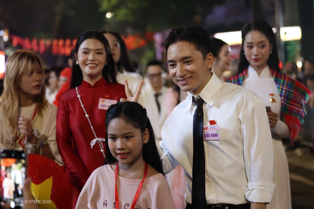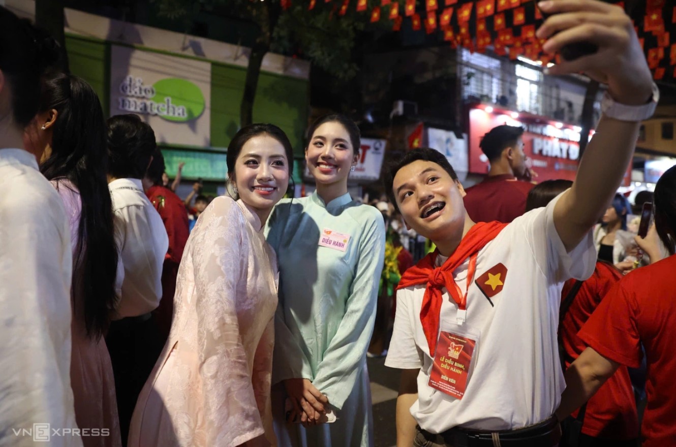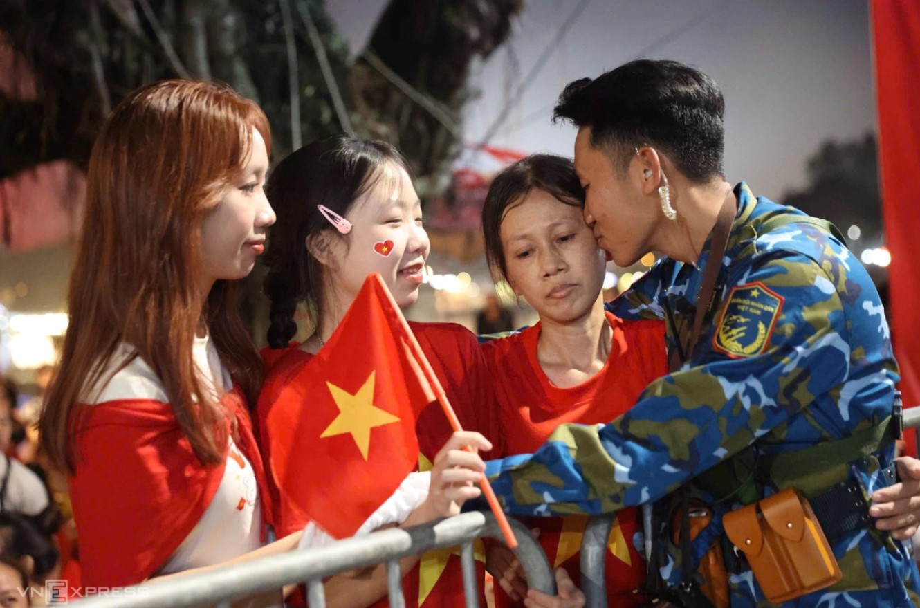 Trên các tuyến Trần Phú, Điện Biên Phủ, Kim Mã, Nguyễn Thái Học, từng hàng dài người đứng sát barie, nhiều gia đình cho trẻ nhỏ ngồi trên vai để nhìn rõ hơn. Hàng nghìn cựu binh được xếp chỗ ngồi ưu tiên, háo hức chờ đoàn quân tiến qua. Trong khán đài, các đoàn đại biểu trong và ngoài nước ngồi kín hơn 30.000 ghế.