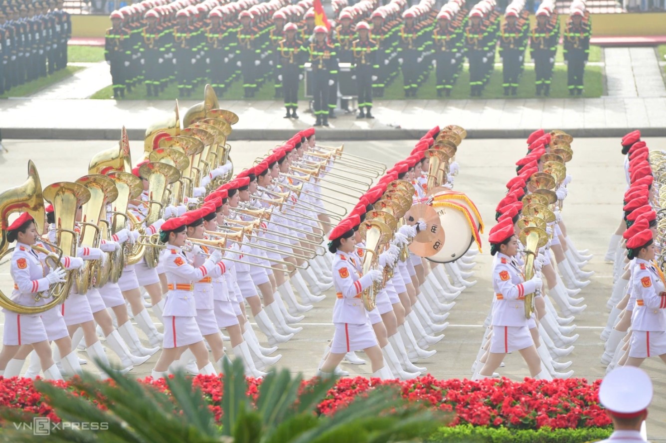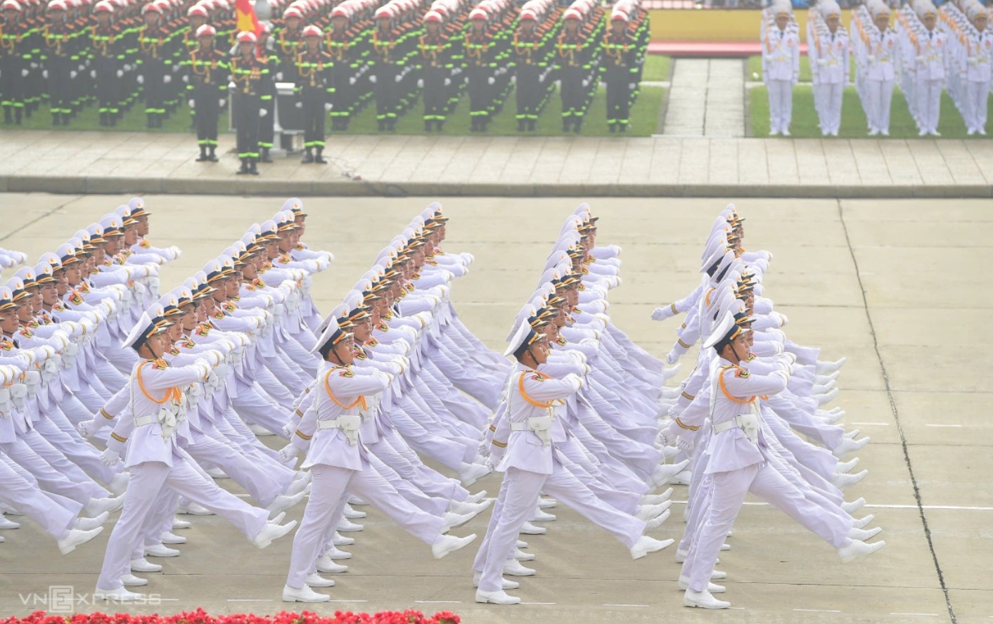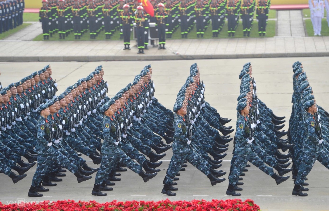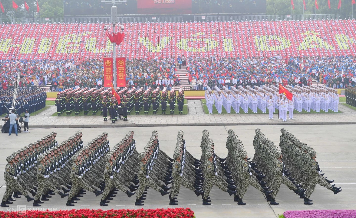 Đúng 7h05, khẩu lệnh "Nghiêm! Lễ diễu binh diễu hành bắt đầu" phát đi từ Thượng tướng Nguyễn Văn Nghĩa, Phó tổng Tham mưu trưởng Quân đội nhân dân Việt Nam, mở đầu cuộc diễu binh, diễu hành có quy mô lớn nhất từ trước tới nay với 16.300 cán bộ, chiến sĩ, chia thành 43 khối hành tiến gồm 26 khối Quân đội, 17 khối Công an; 18 khối nghi lễ đứng chào, cùng sự hiện diện của bốn khối quân đội nước bạn gồm Trung Quốc, Nga, Lào và Campuchia.