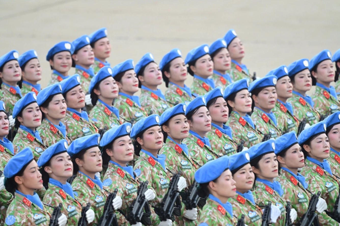 Khối Nữ sĩ quan gìn giữ hòa bình - đại diện cho lực lượng mũ nồi xanh với hành trình hơn 10 năm đưa hơn 1.000 chiến sĩ tham gia thực hiện nhiệm vụ gìn giữ hòa bình Liên Hợp Quốc.
