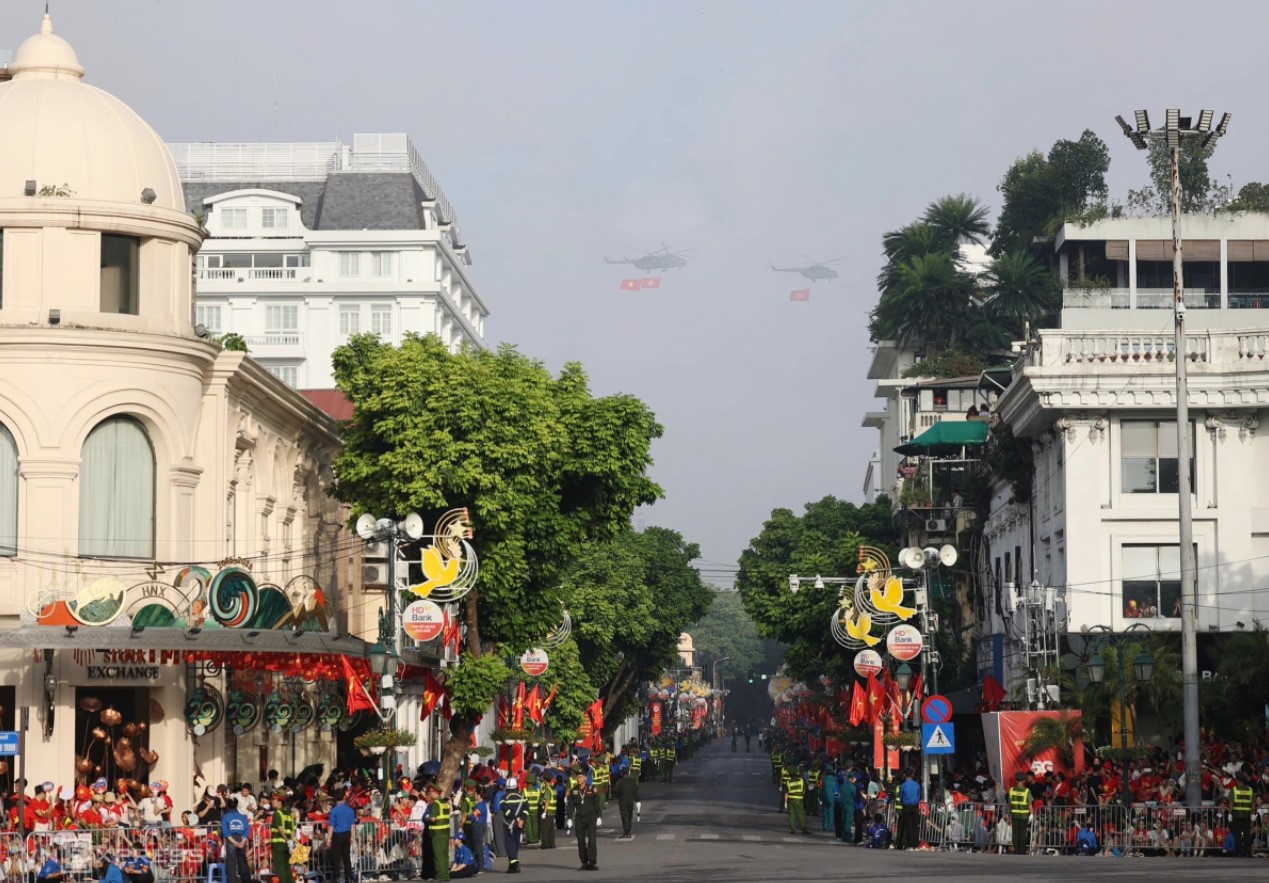 Sau khi qua lễ đài quảng trường Ba Đình, các khối đi bộ đi theo sẽ tỏa ra ba hướng gồm: Nguyễn Thái Học - Kim Mã - Liễu Giai - Văn Cao - sân vận động Quần Ngựa; Nguyễn Thái Học - Tràng Thi - Tràng Tiền - Nhà hát Lớn và Nguyễn Thái Học - Lê Duẩn - Trần Nhân Tông - Công viên Thống Nhất. Dẫn đầu là xe chỉ huy do thượng tướng Nguyễn Hồng Thái, Thứ trưởng Quốc phòng, dẫn đầu.