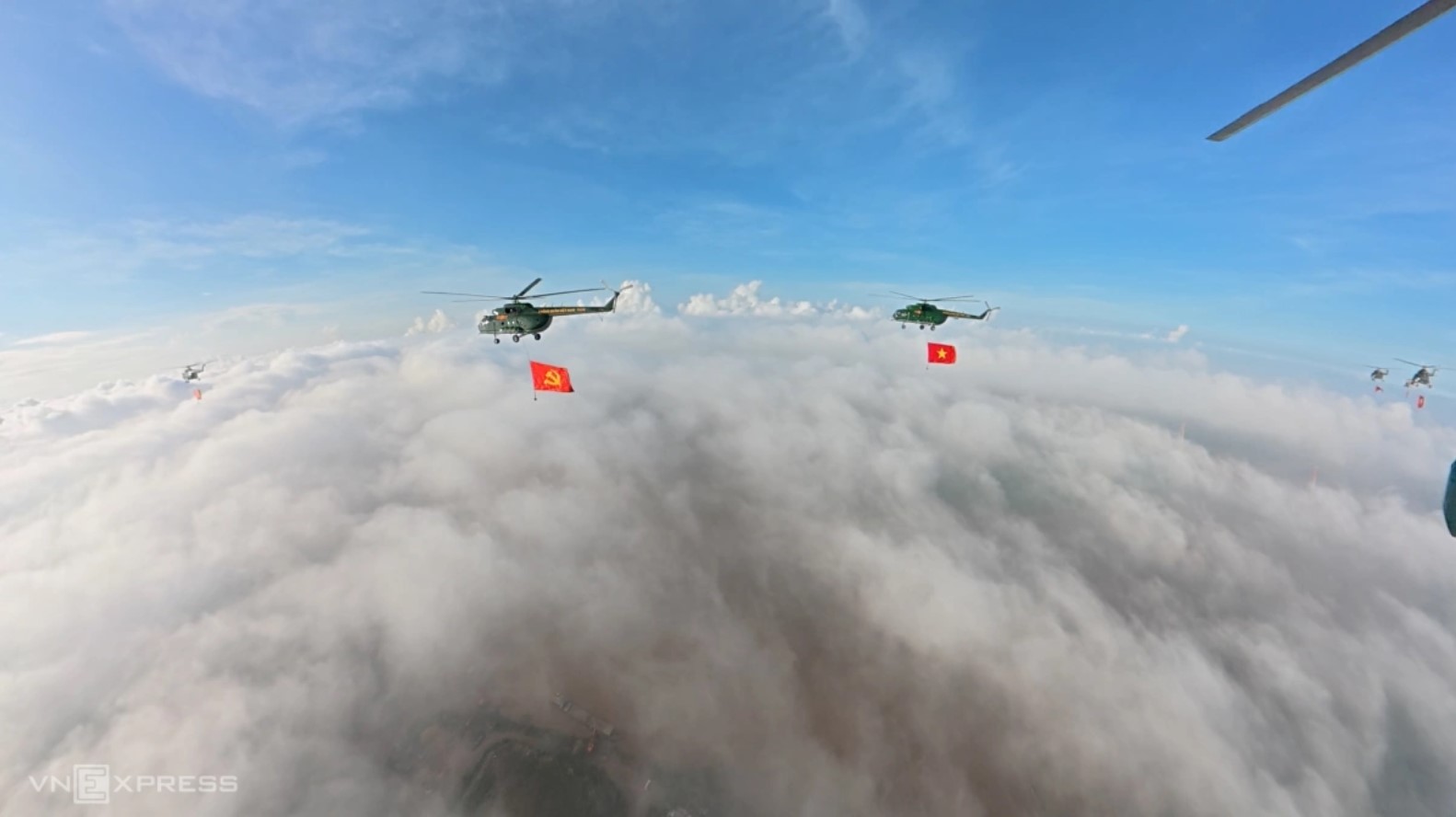 Bầu trời Thủ đô rền vang ngay từ phút mở màn. Các biên đội của Không quân nhân dân Việt Nam lần lượt xuất hiện, mở đầu cho lễ diễu binh, diễu hành sáng 2/9. Dẫn đầu là trực thăng Mi-171, Mi-17, Mi-8 của Trung đoàn Không quân 916, Sư đoàn 371, cất cánh từ sân bay Hòa Lạc, mang theo cờ Đảng, cờ Tổ quốc khổng lồ. Đội hình xuyên mây, bay qua cầu Nhật Tân, Long Biên, Hồ Gươm, Cột cờ Hà Nội, hướng về Quảng trường Ba Đình - biểu tượng cho sức mạnh đại đoàn kết, niềm tự hào dân tộc và khát vọng vươn cao trong kỷ nguyên mới.