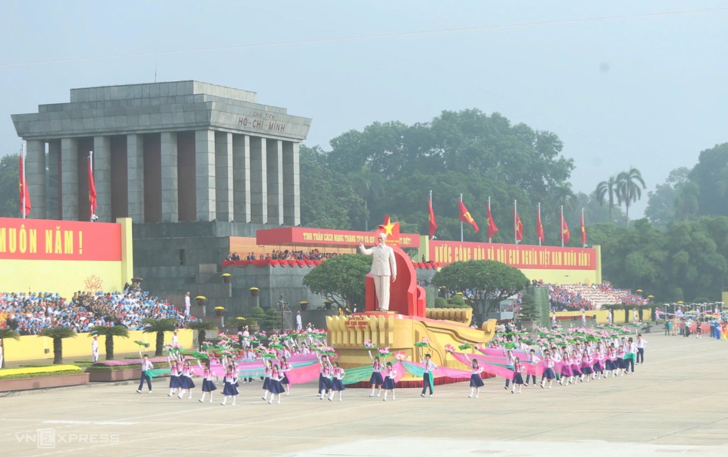 Tại Quảng trường Ba Đình, khối nghi trượng mở đầu với xe mô hình Quốc huy đặt trên nền trống đồng Đông Sơn, khối Quốc kỳ - Đảng kỳ, xe rước chân dung Chủ tịch Hồ Chí Minh và xe mô hình biểu tượng 80 năm Cách mạng tháng Tám, Quốc khánh 2/9.